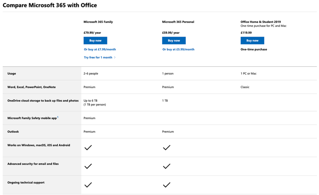 In the main table above it, Office Home & Student 2019 is displayed alongside two far more alluring options. £119.99/$119.99 is a lot cheaper than the cost of Home & Business, but it’s easy to be uninspired when you look at its near-empty column.