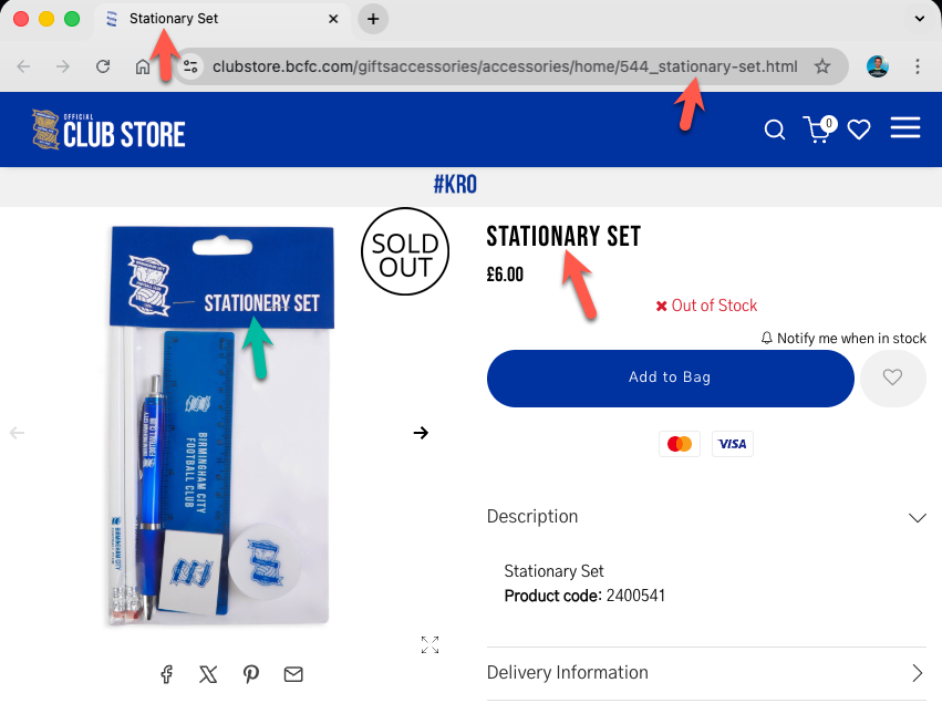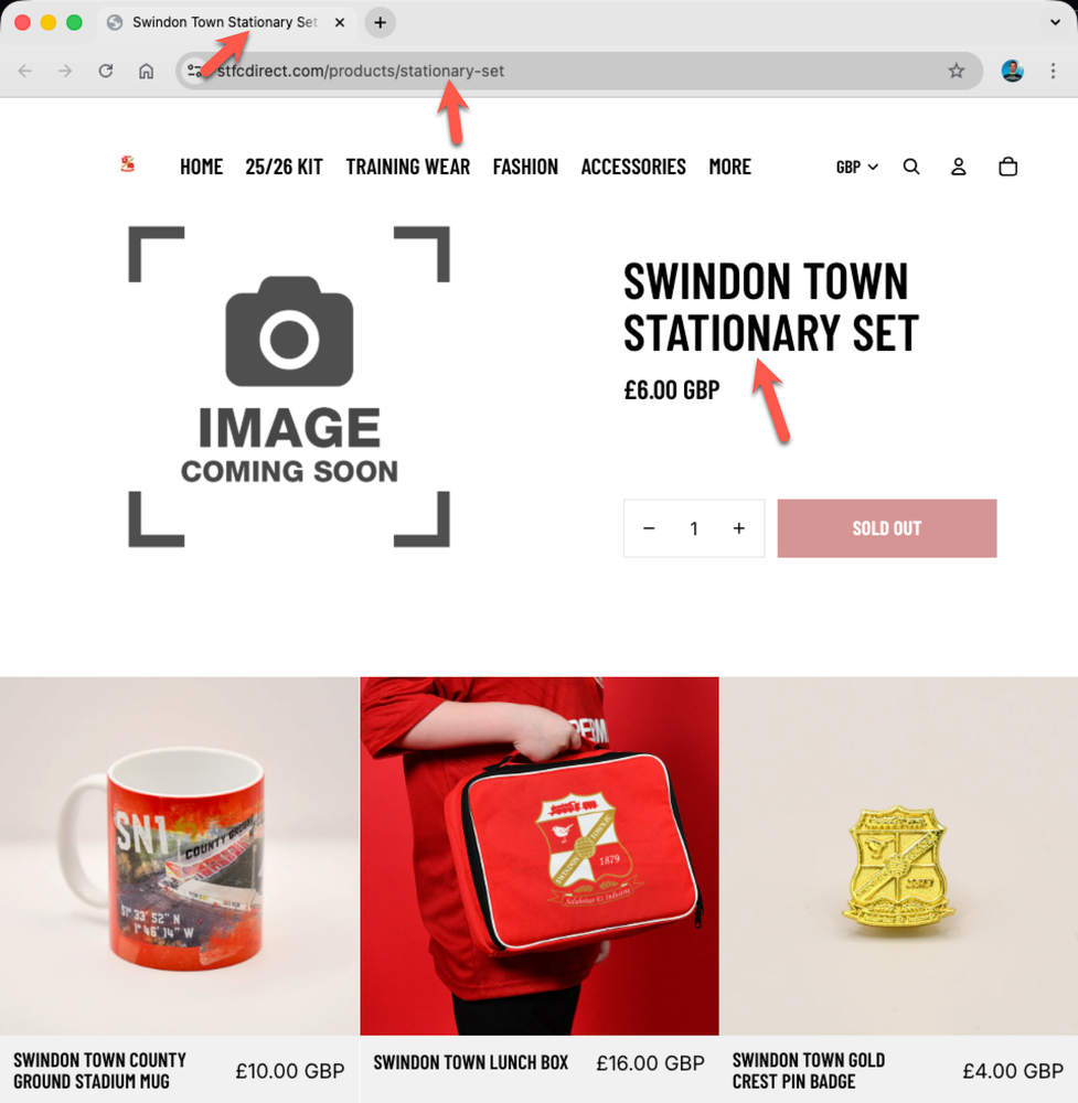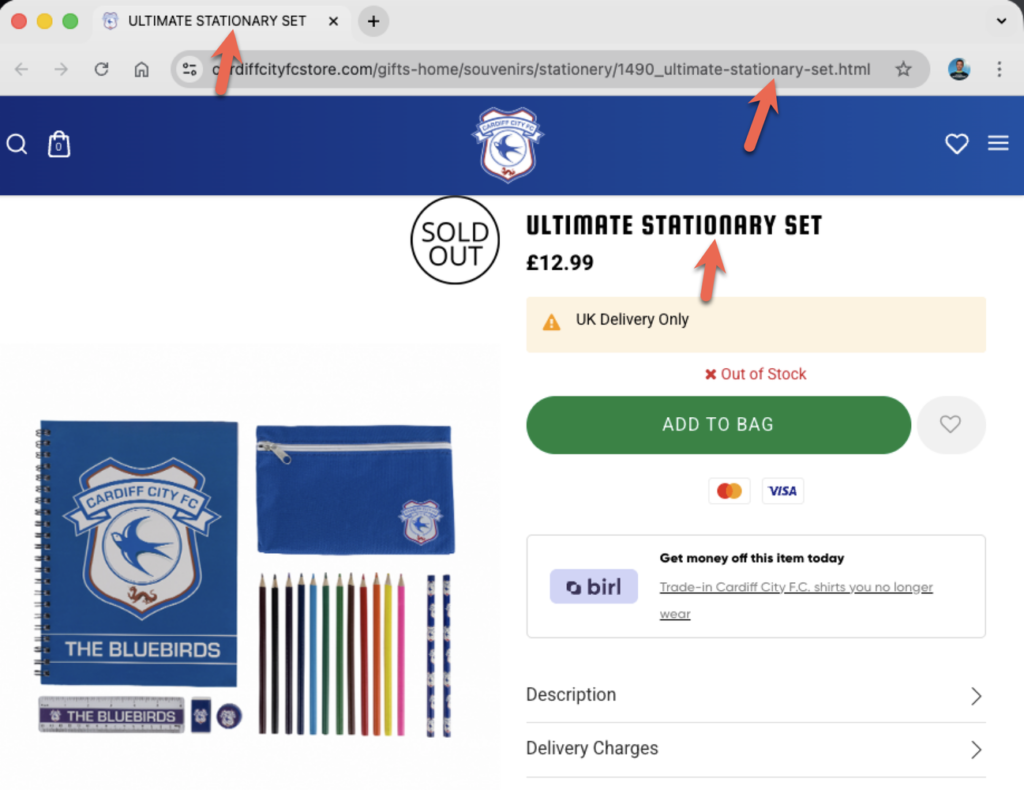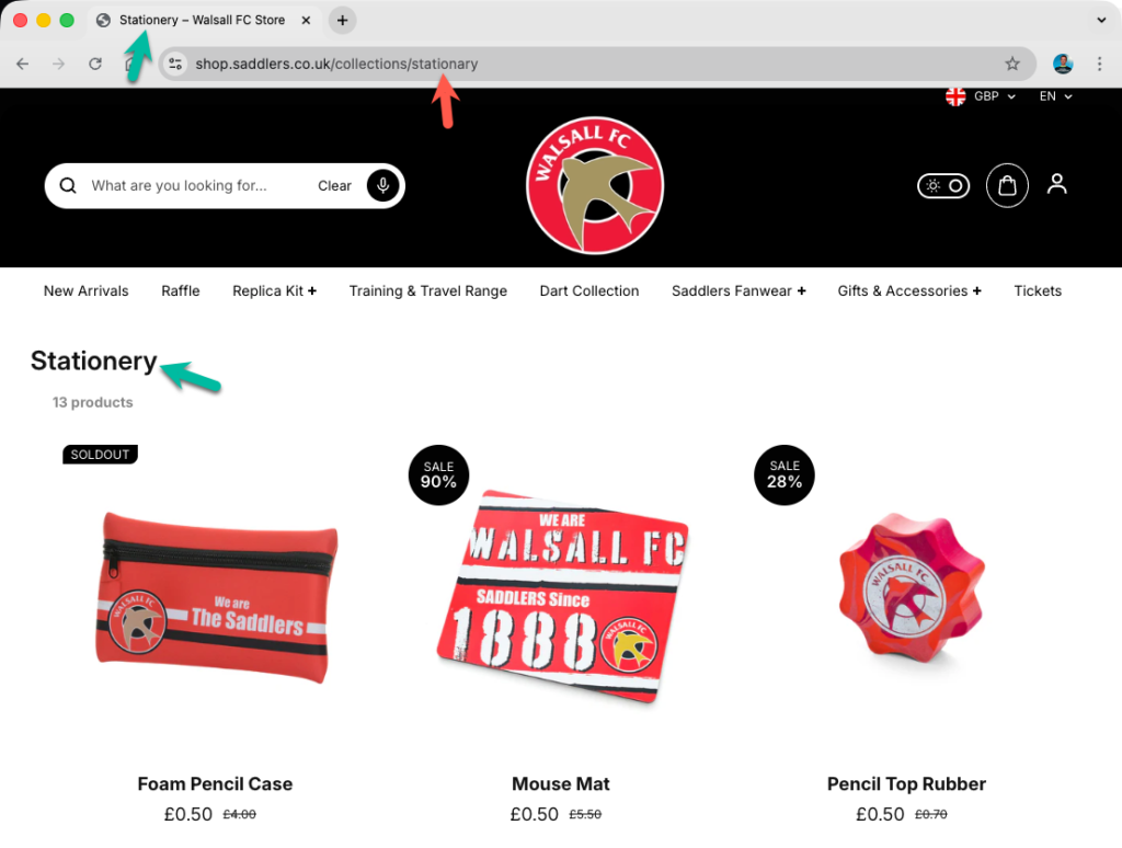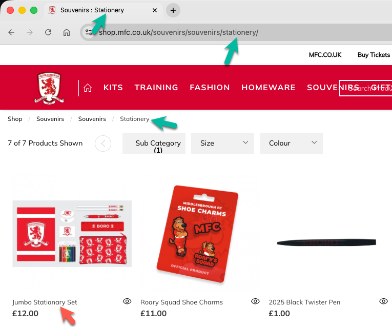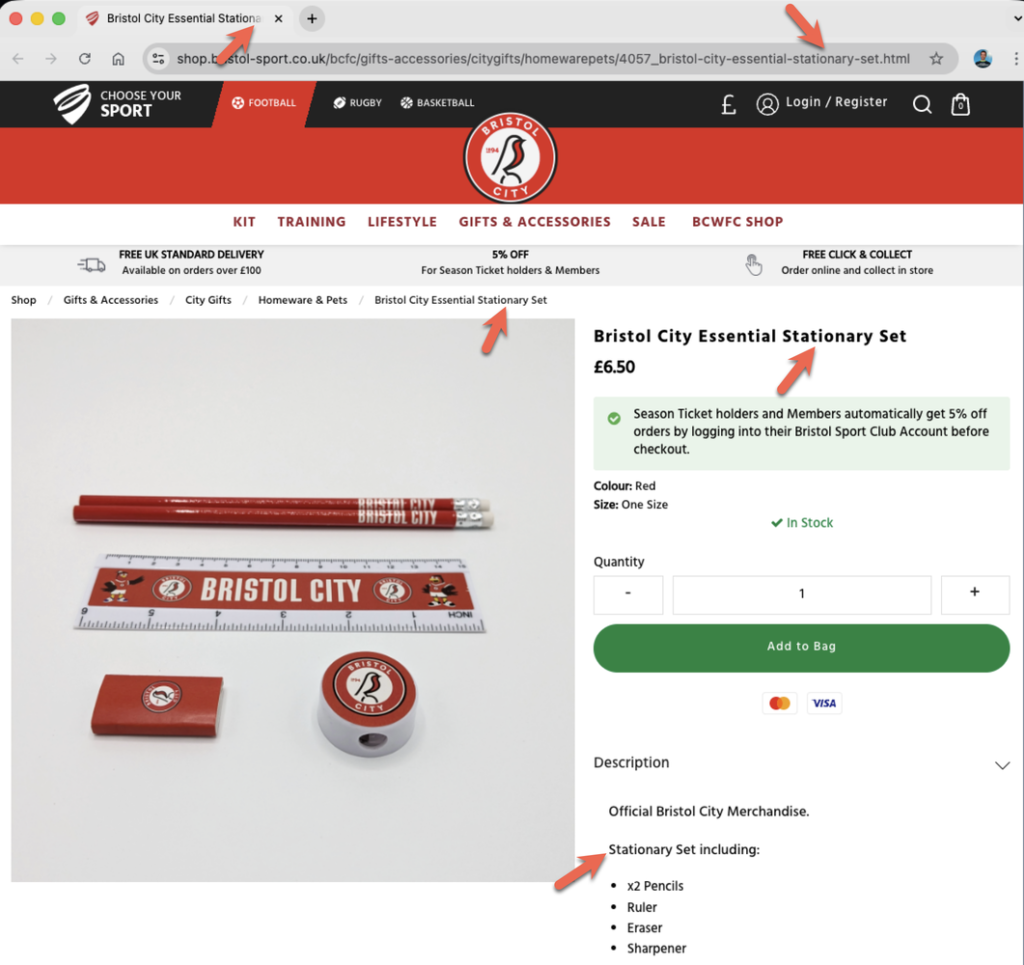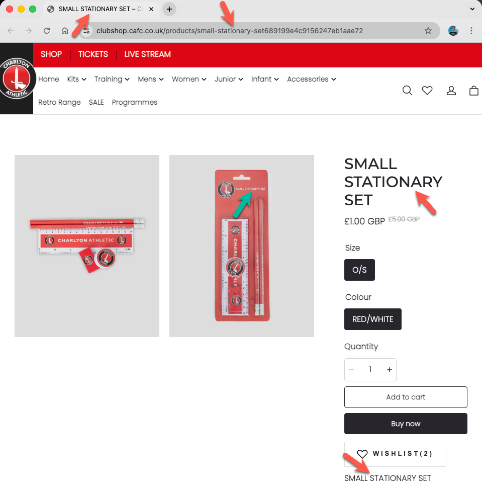 Below, I’ve listed each club along with a link to the affected store page. I’ve also included a screenshot showing the visible evidence of where stationery has been spelt incorrectly (and correctly if mixed). I’ve looked at three different places: the URL, the tab title, and the page content.