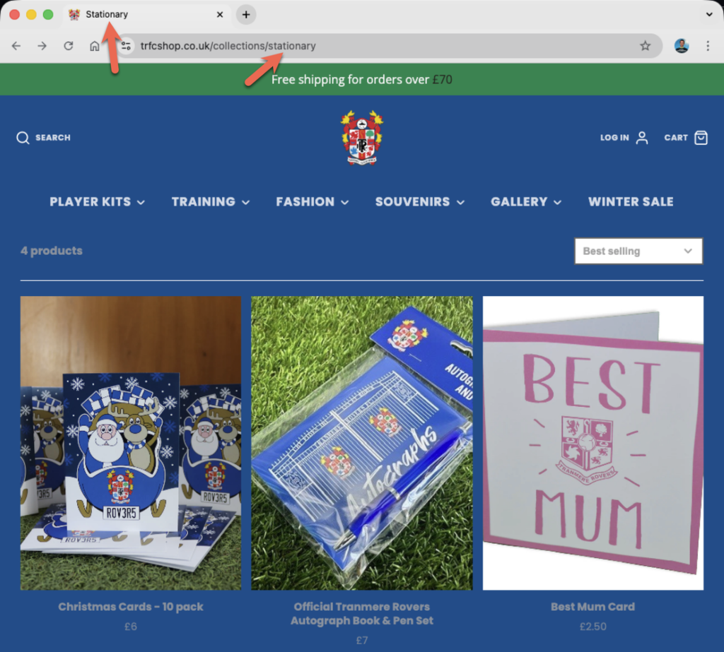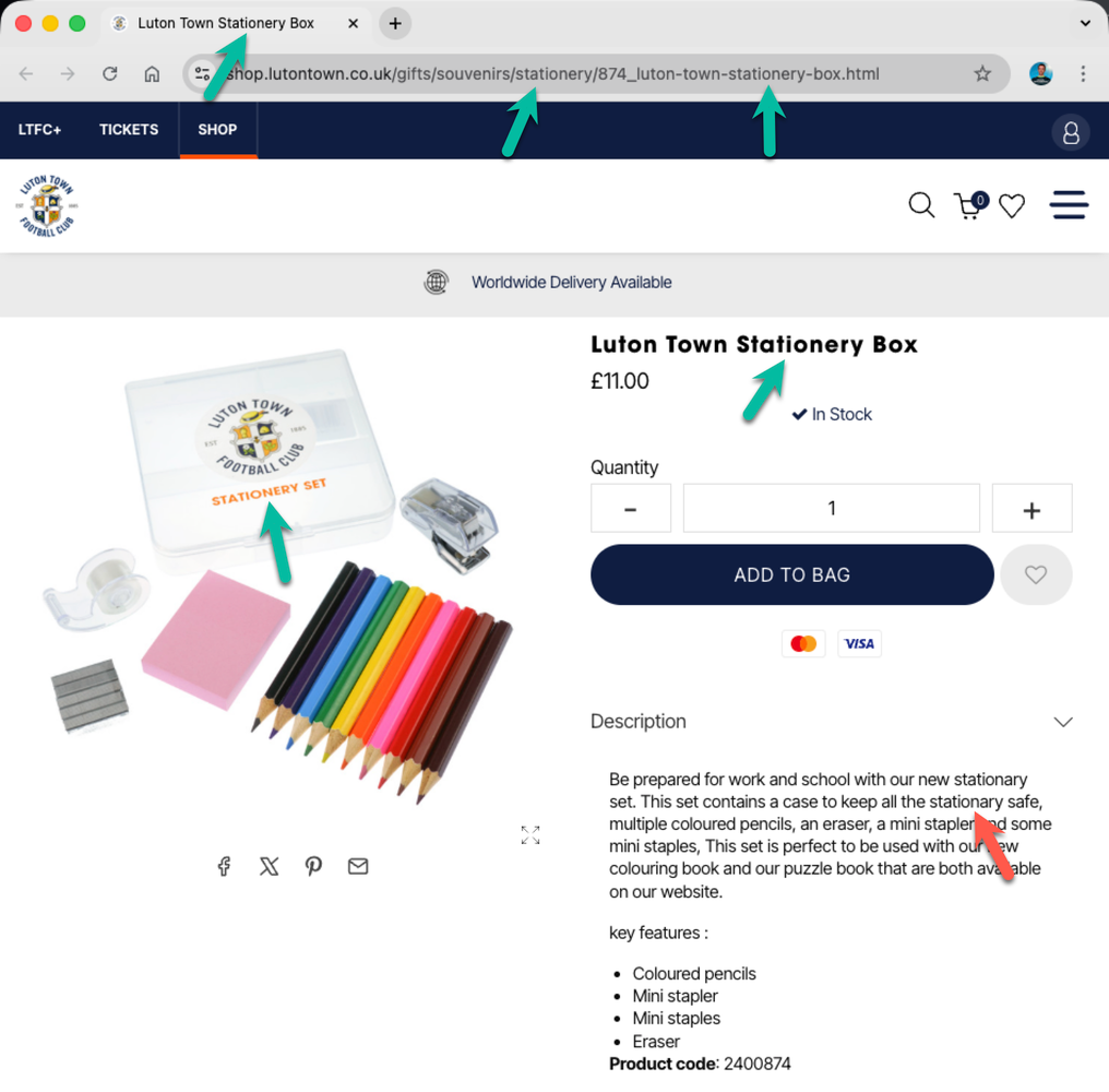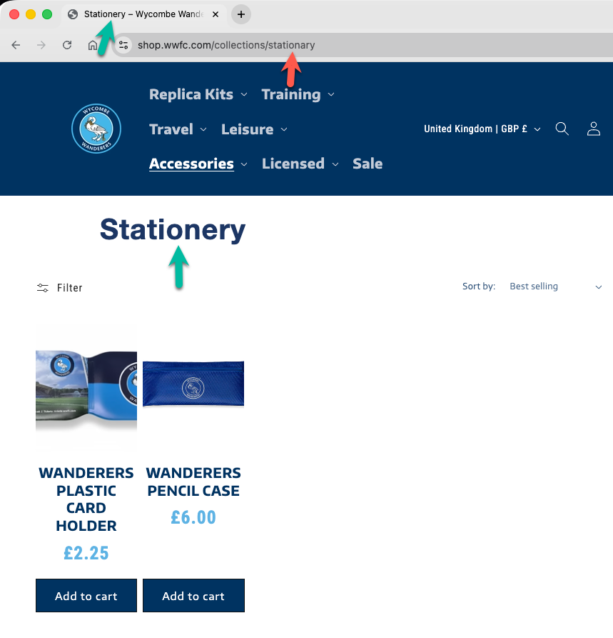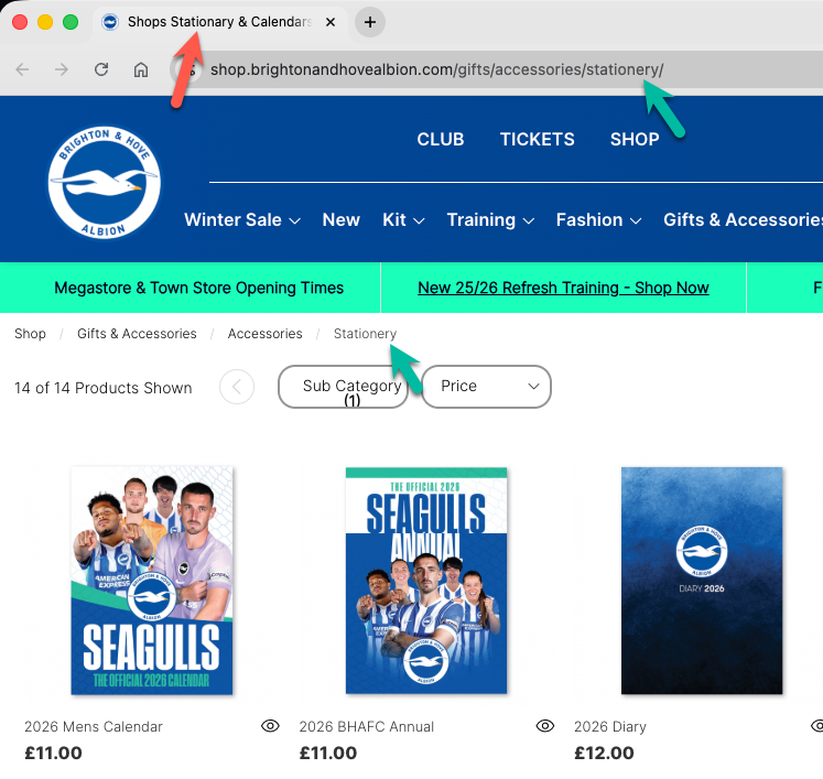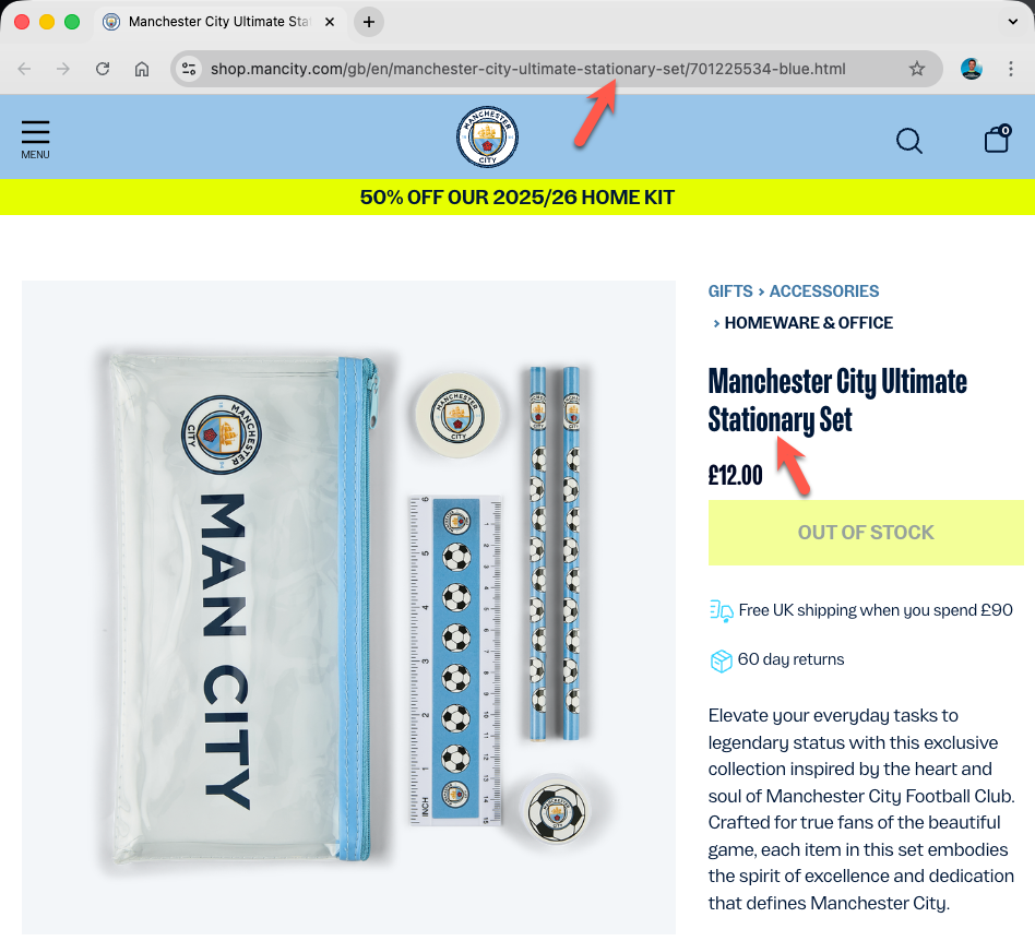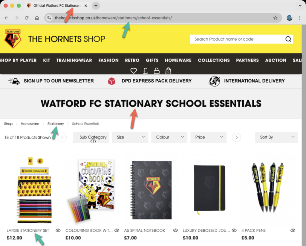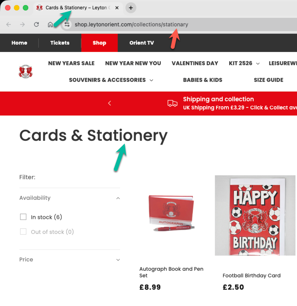 Below, I’ve listed each club along with a link to the affected store page. I’ve also included a screenshot showing the visible evidence of where stationery has been spelt incorrectly (and correctly if mixed). I’ve looked at three different places: the URL, the tab title, and the page content.