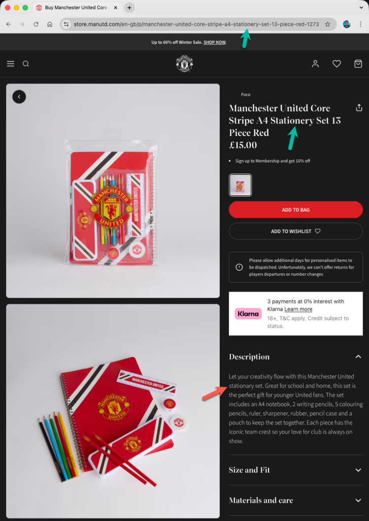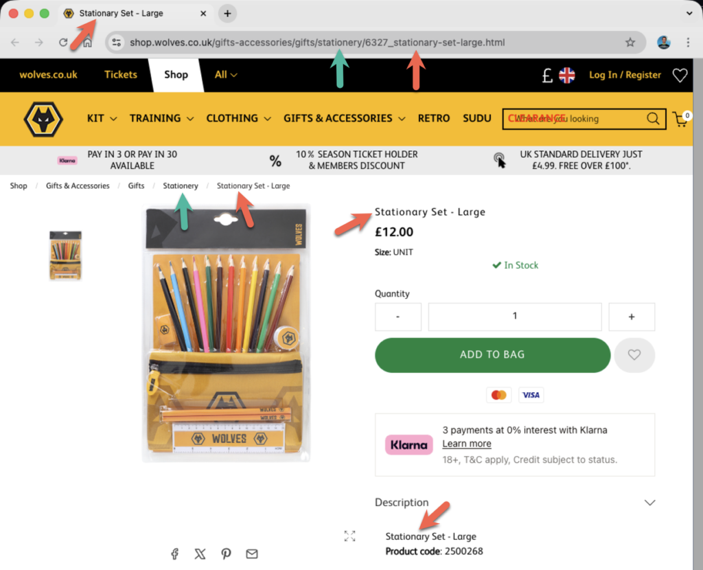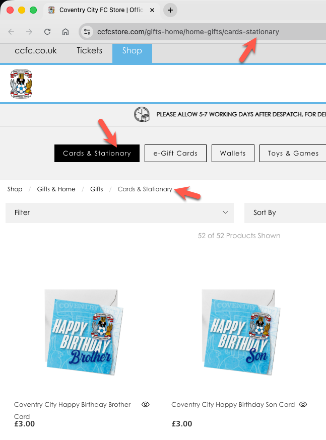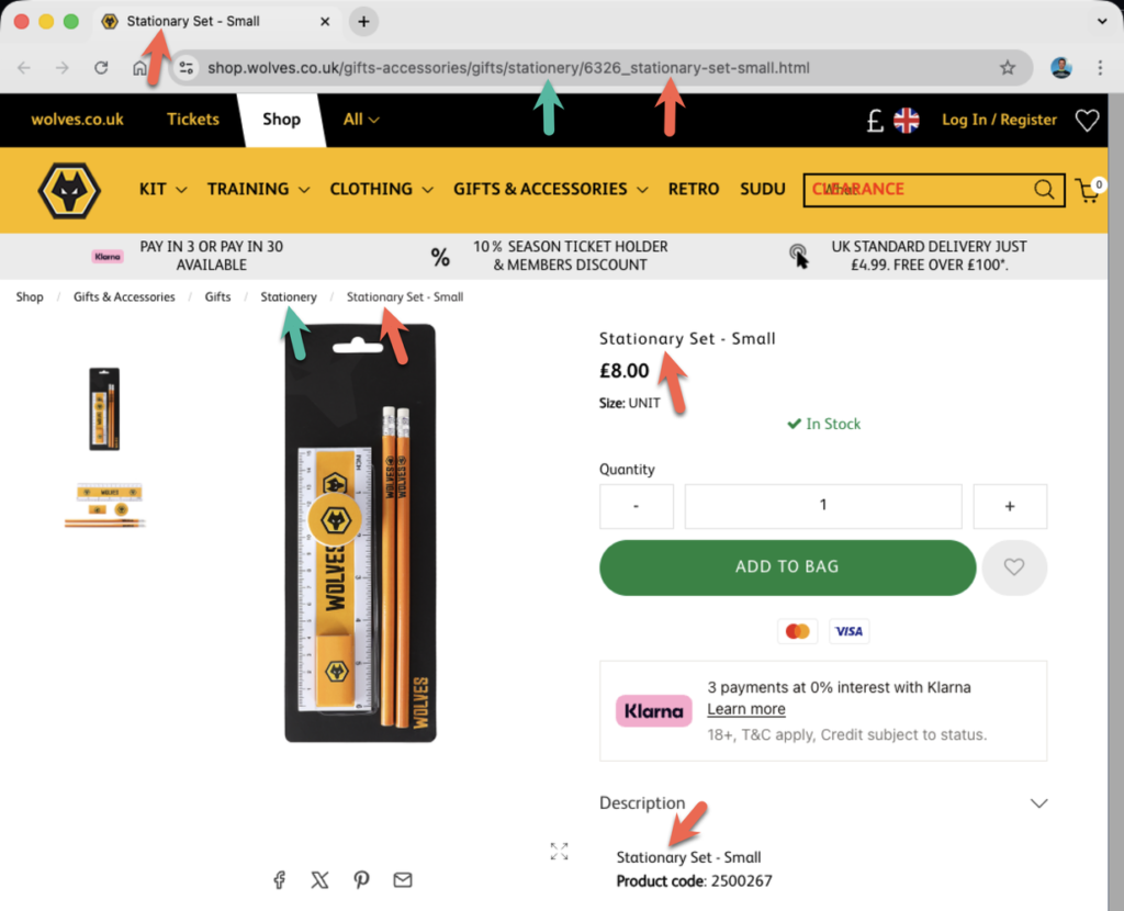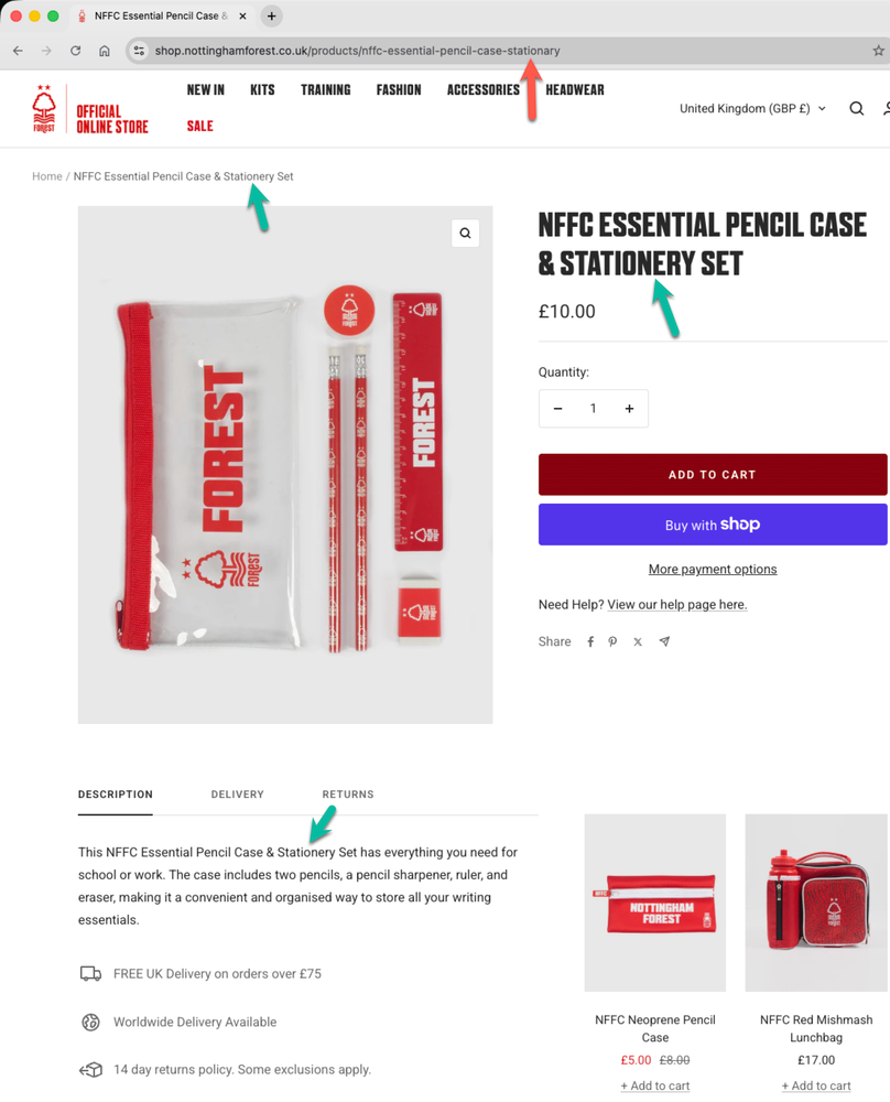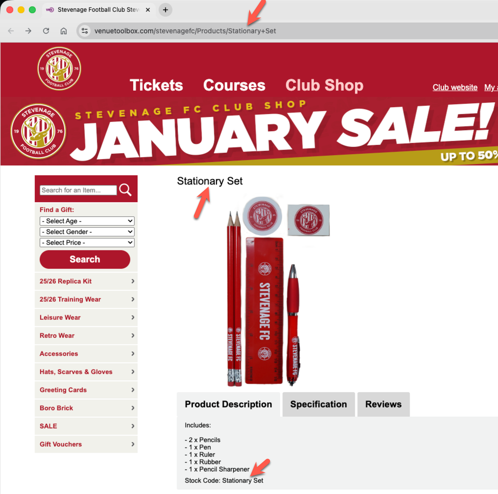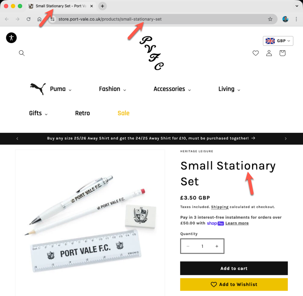 Below, I’ve listed each club along with a link to the affected store page. I’ve also included a screenshot showing the visible evidence of where stationery has been spelt incorrectly (and correctly if mixed). I’ve looked at three different places: the URL, the tab title, and the page content.