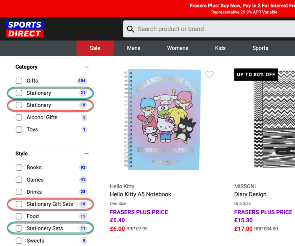 In some cases, these underlying issues surface directly in the interface. On Sports Direct’s site, both “Stationery” and “Stationary” appear as separate filter choices in two places.