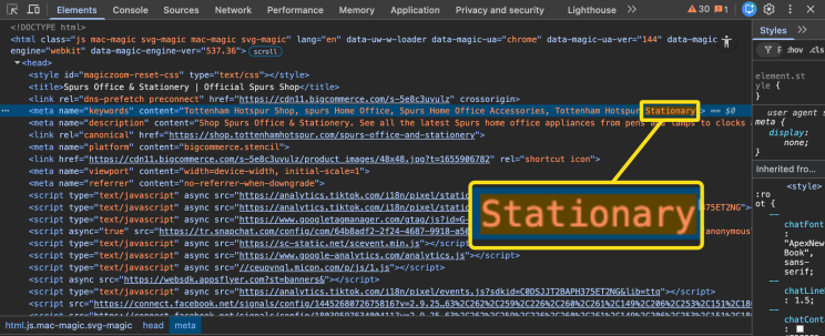 For example, Tottenham Hotspur Football Club’s Office & Stationery page didn’t make the list because it doesn’t contain stationary — not in the URL, the title, or the page copy. However, when I examined the markup, I found one trapped at the end of a meta tag.