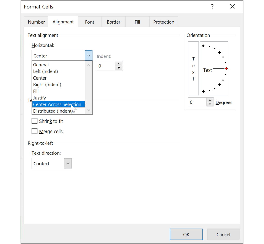 Simply select a horizontal cell range, open the Alignment Settings window from the Home tab (or press Ctrl + 1) and choose Center Across Selection from the first dropdown. Finally, press OK.