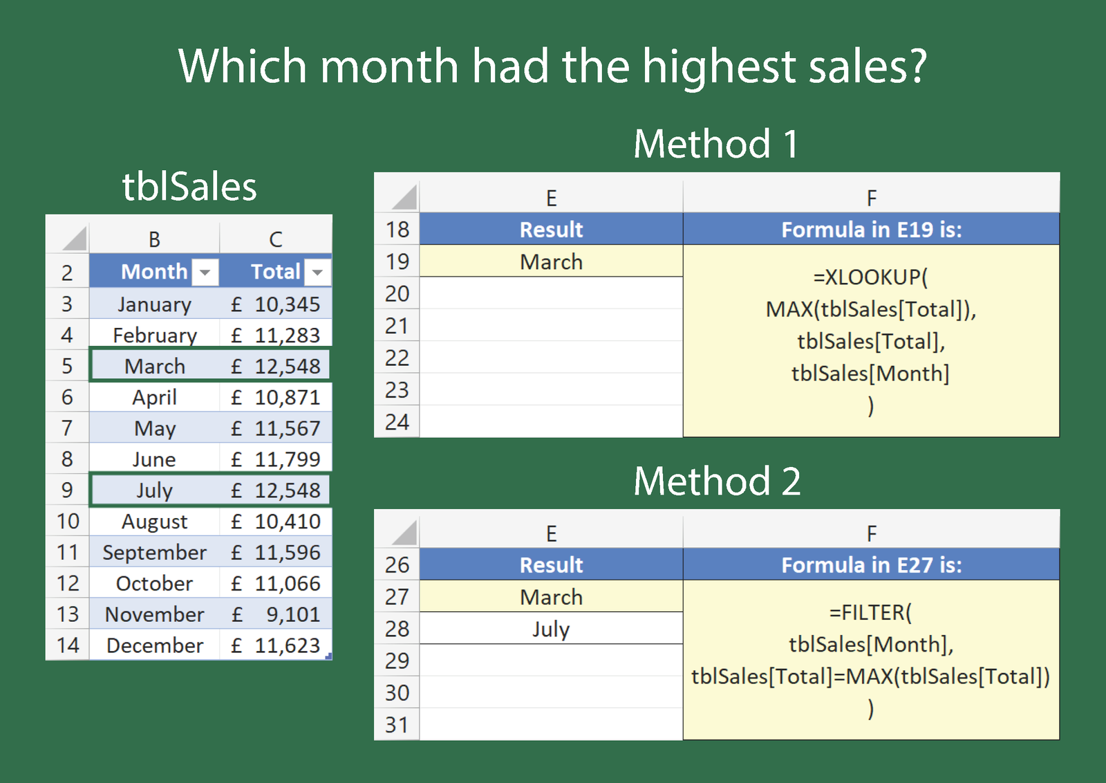In the example, a table called tblSales is present on the left. Method 1 uses an XLOOKUP statement to find the maximum figure in the Total column and returns the adjacent month.